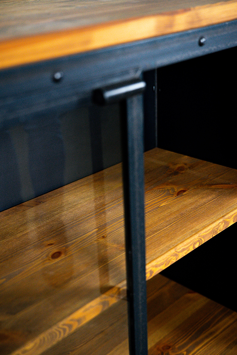 - Gra Kontrastów: Wnętrze skrywa półki z szczotkowanego, olejowanego drewna sosnowego. Ciepło naturalnego rysunku słojów łagodzi surowość stalowego korpusu.