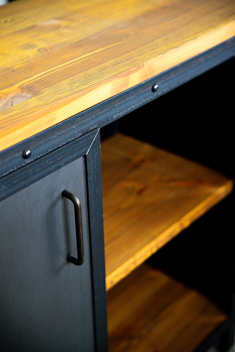 - Otwarta Ekspozycja: Górna nadstawka to trzy solidne, sosnowe półki osadzone w stalowej ramie – doskonałe miejsce na kolekcję szkła, książek lub prestiżowych dekoracji.