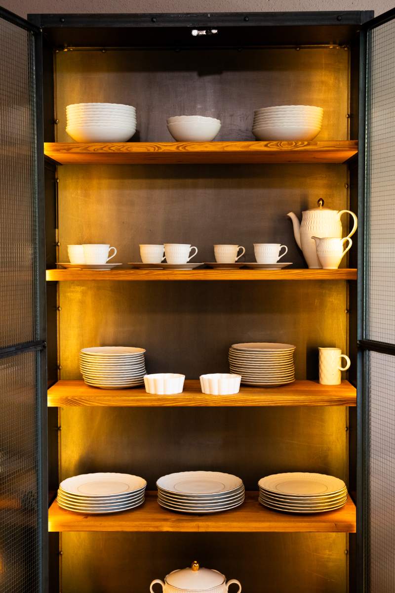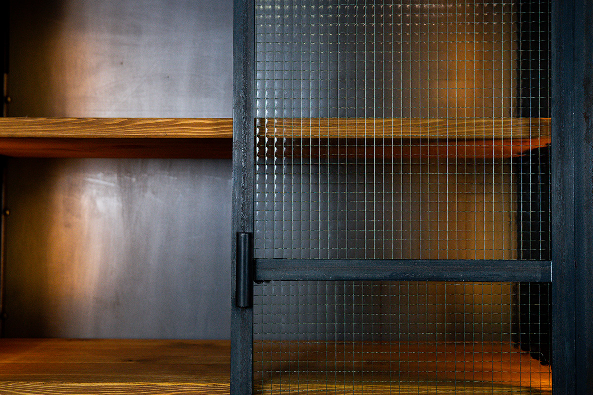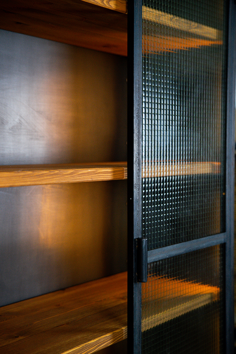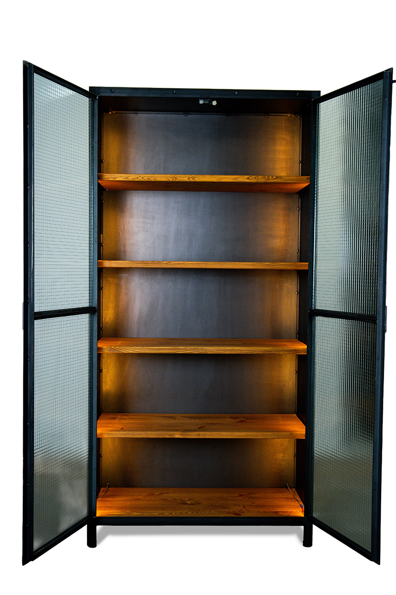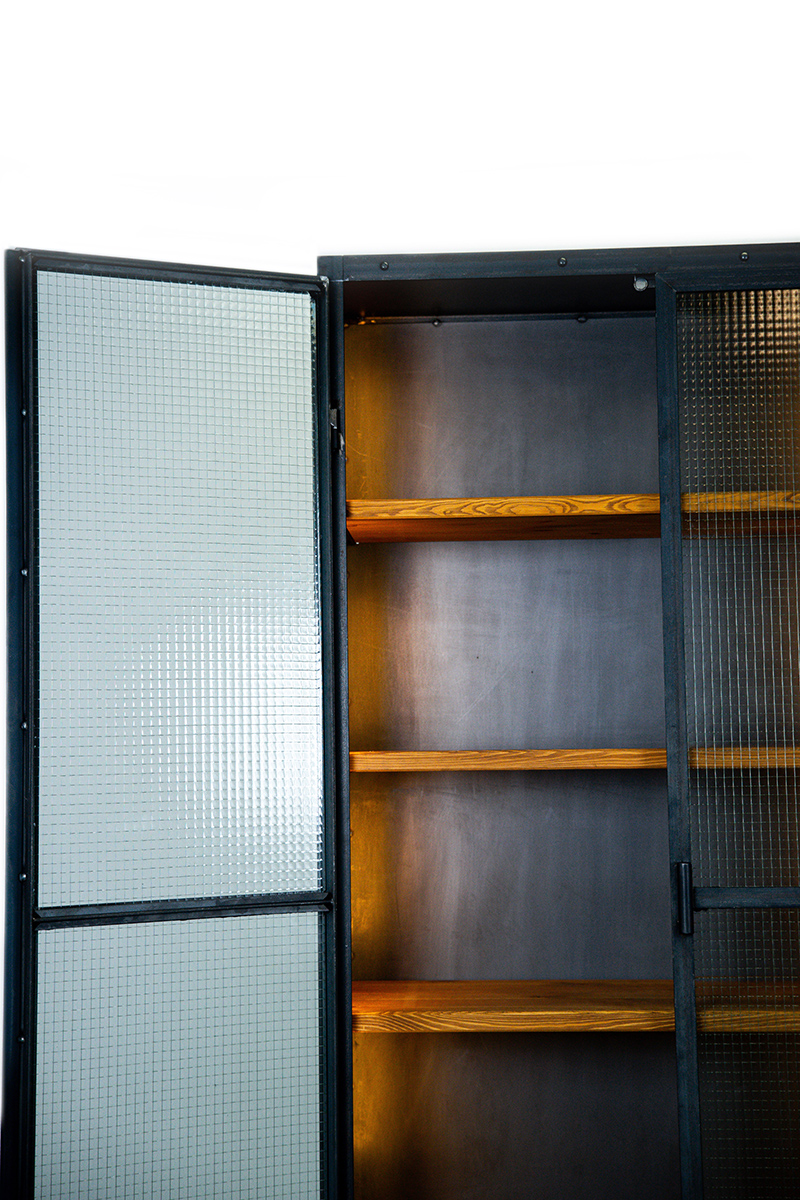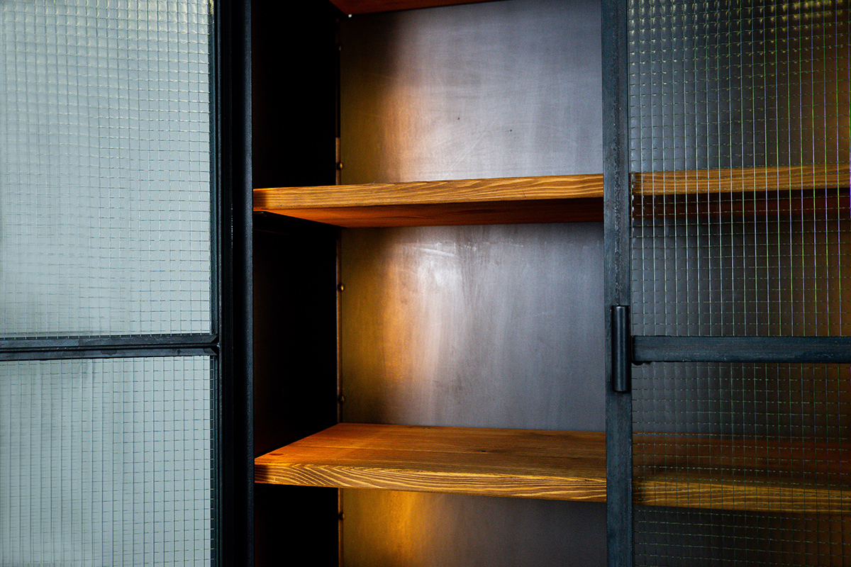 Zastosowane przez nas szkło zbrojone (druciane) to materiał z bogatą historią. Stalowa siatka zatopiona w tafli nie tylko gwarantuje ponadprzeciętną trwałość, ale przede wszystkim tworzy unikatowy efekt wizualny. Delikatnie rozmywa zawartość szafy, nadając jej aurę tajemniczości, a w połączeniu z wewnętrznym oświetleniem LED, rzuca na 5 drewnianych półek hipnotyzującą grę cieni.