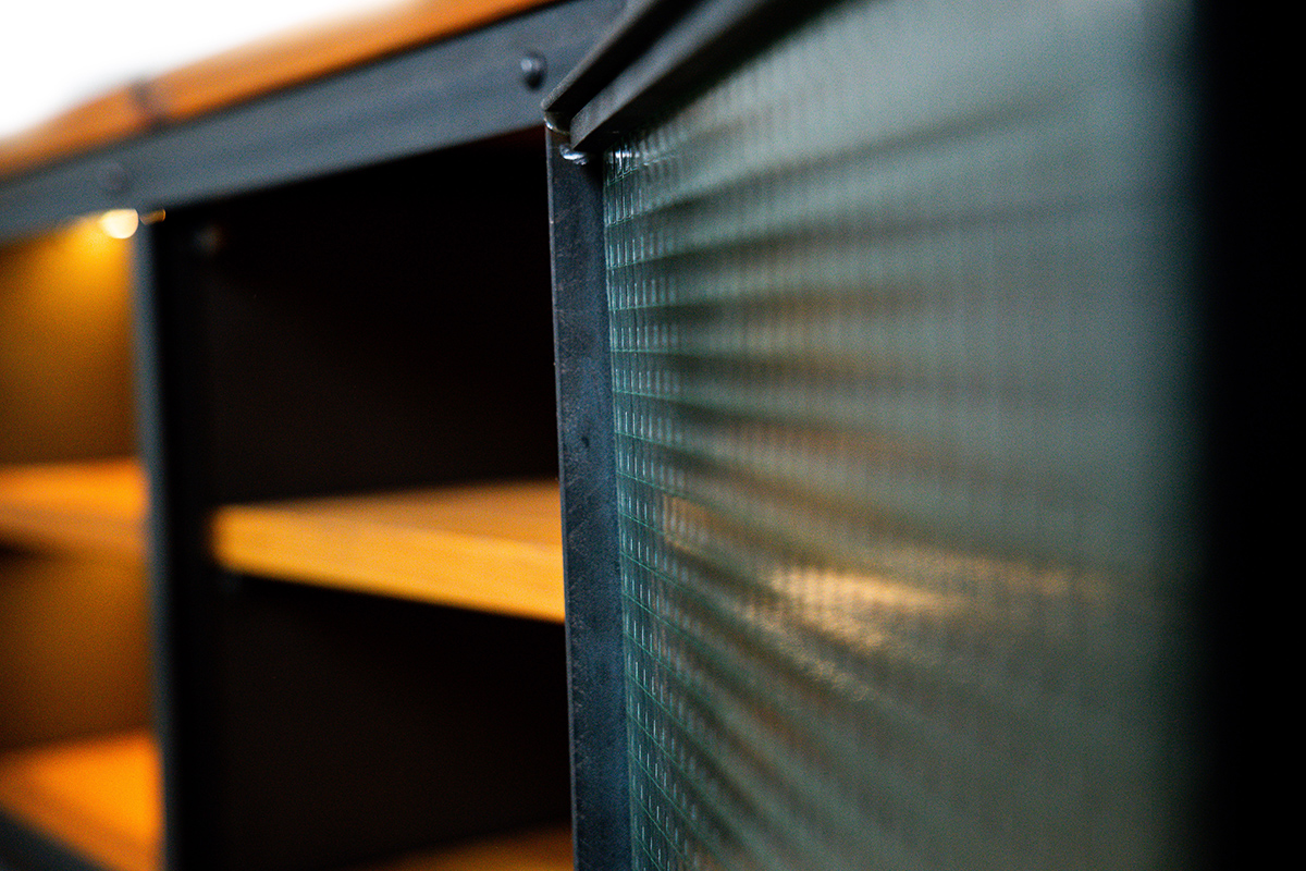 Konstrukcja mebla to prawdziwy waga ciężka: profile stalowe 40/40/4 mm oraz 2-milimetrowa blacha walcowana na gorąco tworzą niezniszczalny szkielet. Jednak głównym bohaterem SZAFKI FILO jest wypełnienie. Zastosowaliśmy tu szkło zbrojone o imponującej grubości 6 mm. Zatopiona w szkle stalowa siatka nadaje mu niepowtarzalną, chropowatą fakturę i charakterystyczny, techniczny wygląd, kojarzony z dawnymi halami produkcyjnymi.