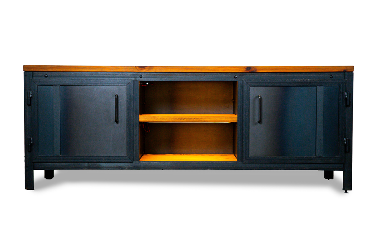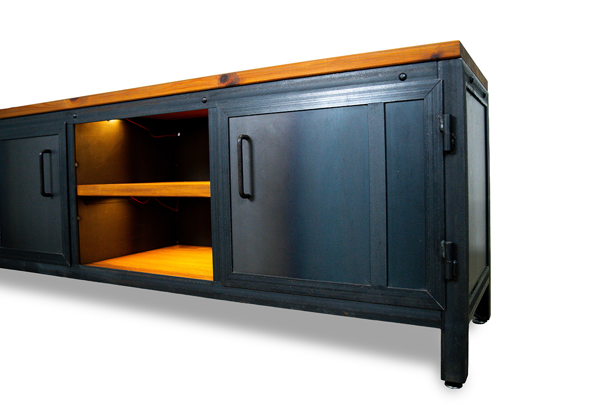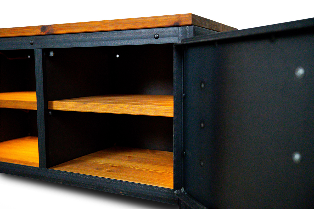 SZAFKA Pieno to coś więcej niż mebel pod telewizor – to solidny fundament nowoczesnej strefy rozrywki. Zaprojektowana z myślą o szerokich ekranach i rozbudowanych systemach audio, łączy w sobie brutalistyczny urok stali z ciepłem naturalnego drewna. To manifest rzemiosła, który nadaje rytm całemu salonowi.