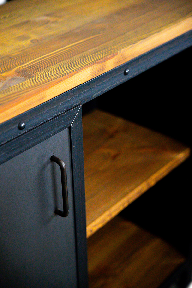 Szeroki blat oraz system wewnętrznych półek wykonaliśmy z szczotkowanego drewna sosnowego. Proces ten uwydatnił głębię słojów, a naturalny olej zabezpieczył strukturę, czyniąc ją miłą w dotyku. To idealny balans między chłodem przemysłowej konstrukcji, a organicznym luksusem.
