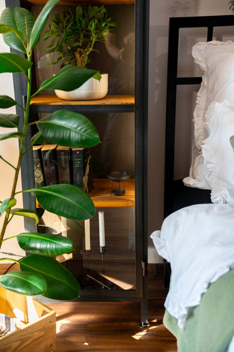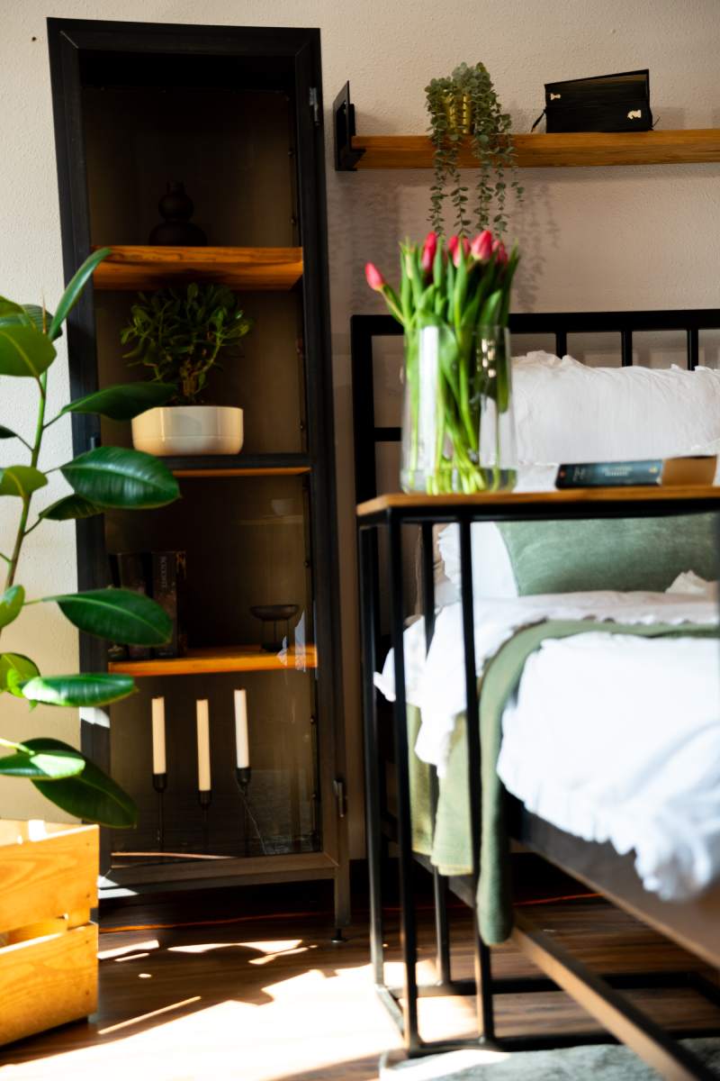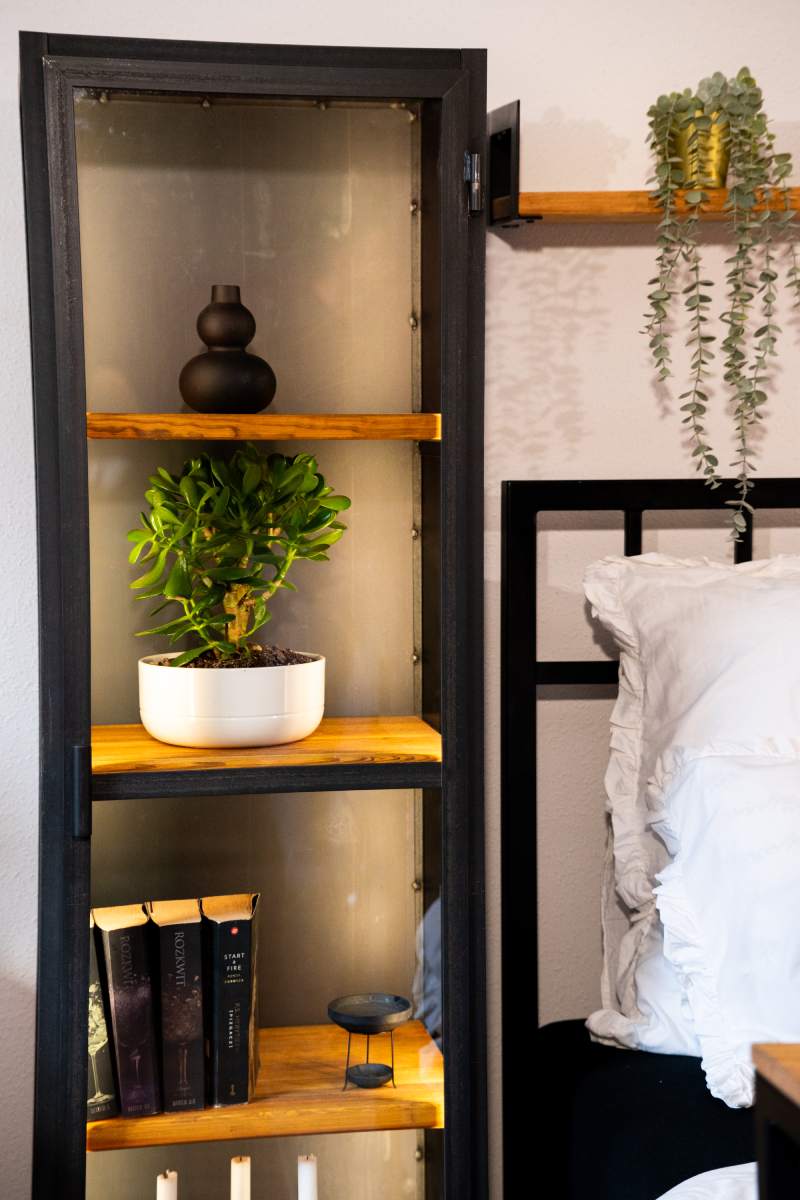 - Harmonia Materiałów: Cztery poziomy półek z szczotkowanego drewna sosnowego przełamuje chłód stali, wprowadzając do pomieszczenia przytulną aurę.
