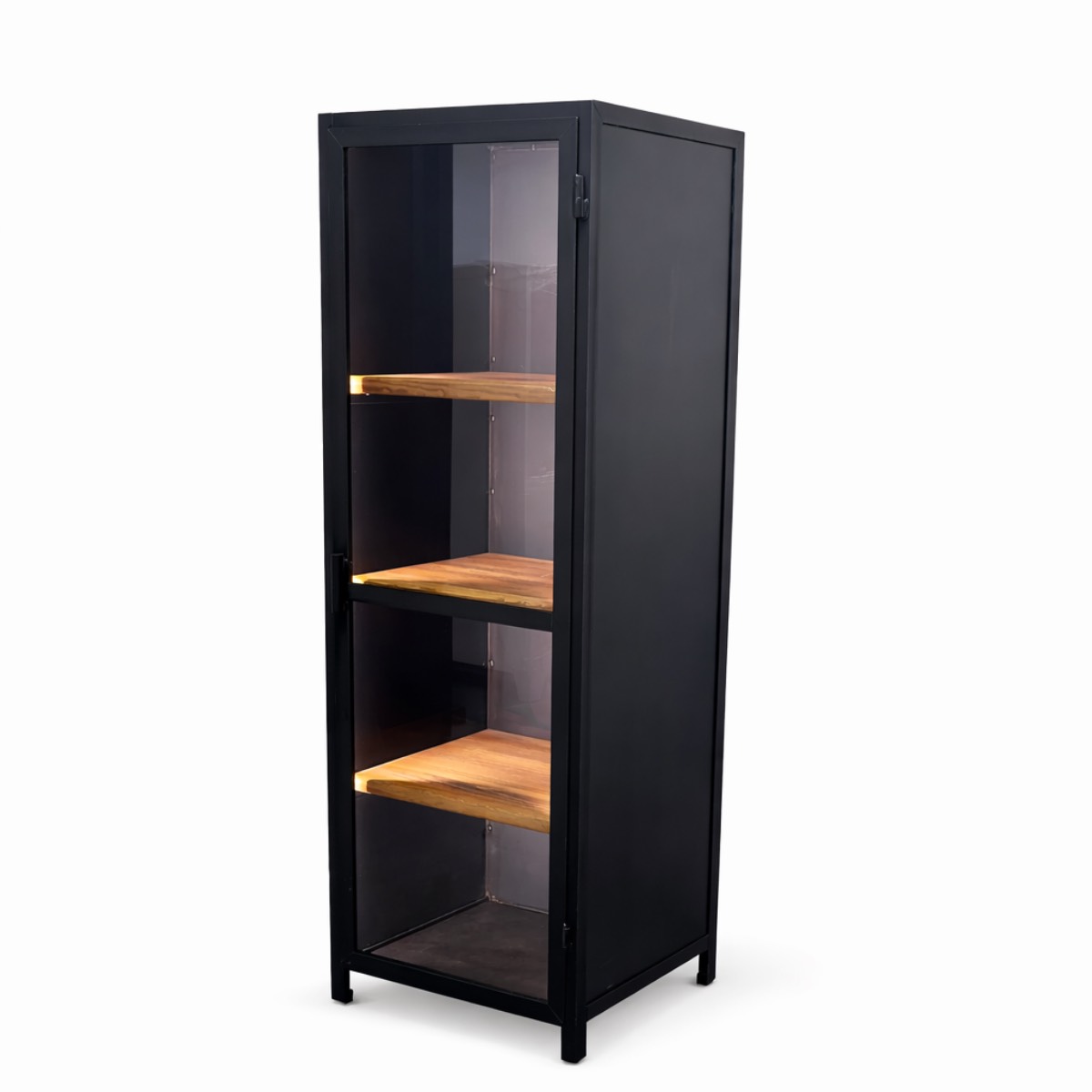 Odkryj potęgę rzemiosła zaklętą w smukłej formie. WITRYNA VETRO I to nie tylko mebel – to manifest stylu loftowego, w którym surowość stali spotyka się z ciepłem naturalnego drewna i przejrzystością szkła.